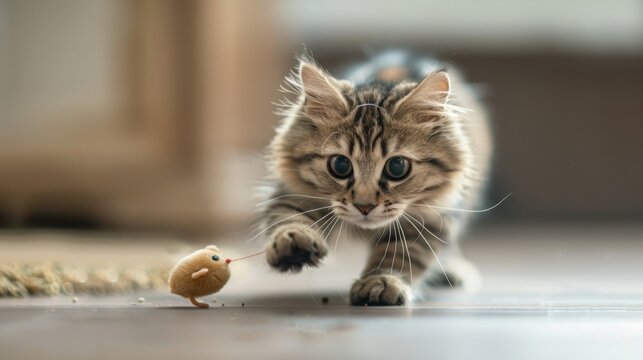 Adorable kitten with wide eyes pouncing playfully on a toy mouse on a wooden floor in a warm indoor setting. Perfect for pet lovers.