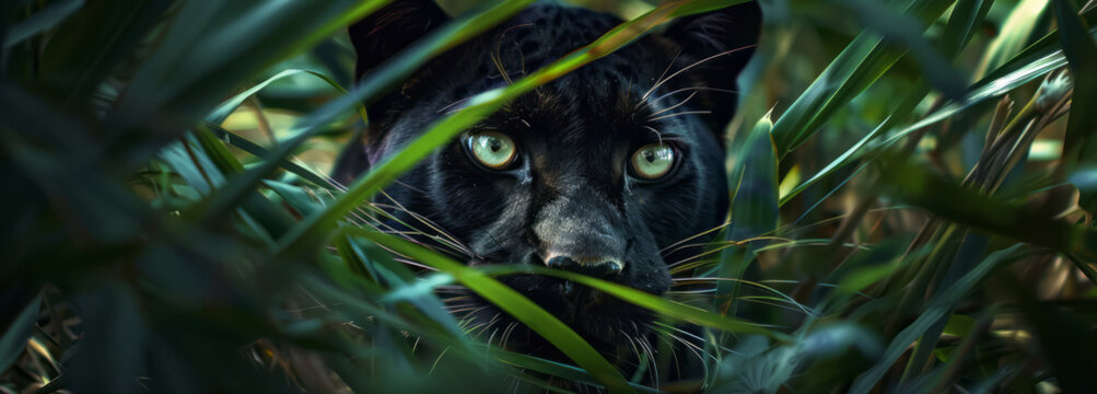 A panther with eyes peeking out from the jungle, hidden in shadows and grasses, ready to pounce.