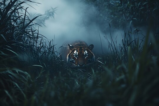 A tiger crouching low in the tall grass on a foggy night ready to pounce in the dark wilderness