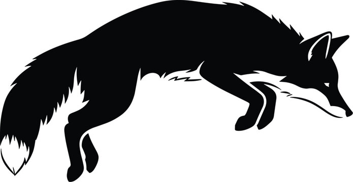 Minimal vector silhouette, leaping fox pounce arc, forelegs tucked, side profile, solid black