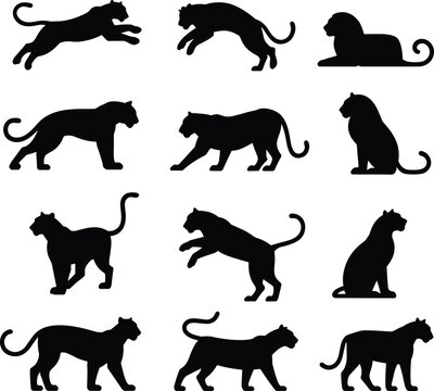 Black panther lion cheetah silhouettes in various poses, sitting walking running jumping, cad drawing, flat vector illustration, isolated animal
