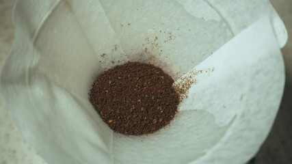 Pour over filter with ground coffee in the funnel in focus. Drip filter coffee brewing. Pour over alternative method of pouring water over roasted and ground coffee beans contained in filter.