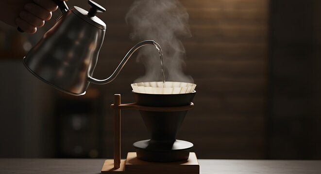 Pouring hot water from kettle into coffee filter on a pour over stand in a dimly lit environment