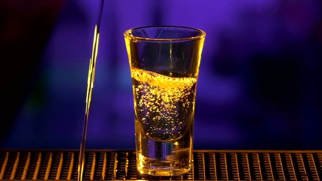 Bartender pouring Mexican Tequila into shot glasses at bar counter, closeup