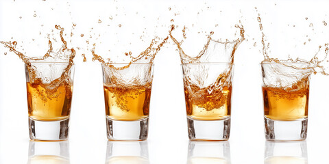 A banner of a row of 5 shot glasses containing different colored liquor with light splashes on a white background, party vibes.