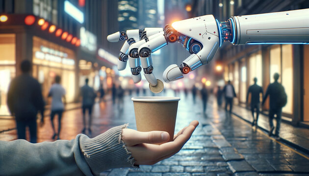 Robot giving coins to a homeless person on a busy city street, close up