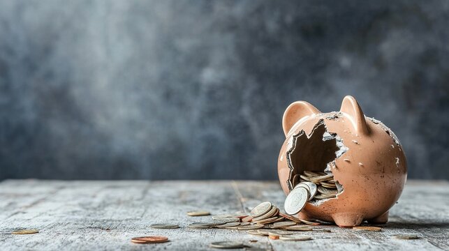 Economic Struggles, shattered piggy banks, fallen coins, symbolizing financial hardship and the impact of economic decline