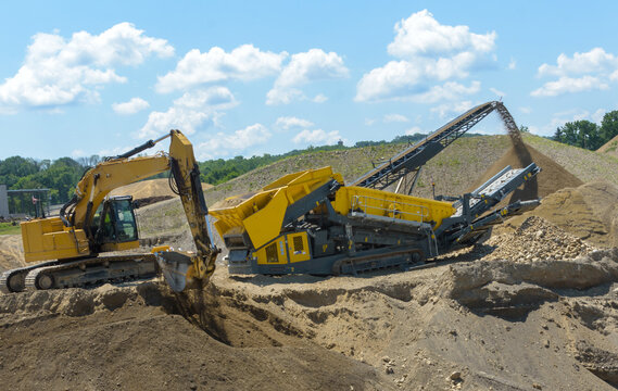 Large excavator lifting a shovelful of dirt to load into dirt rock separator at a large excavation site