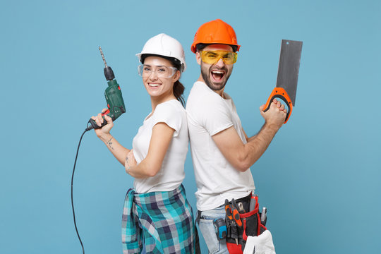 Excited couple woman man in protective helmet hardhat hold electric drill saw isolated on blue background. Instruments accessories renovation apartment room. Repair home concept. Stand back to back.