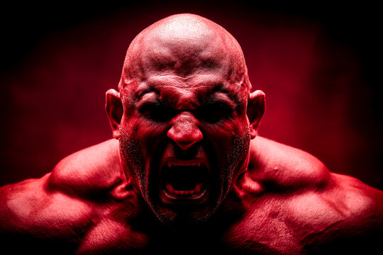 Intense expression of a muscular figure illuminated in red under harsh lighting Generative AI