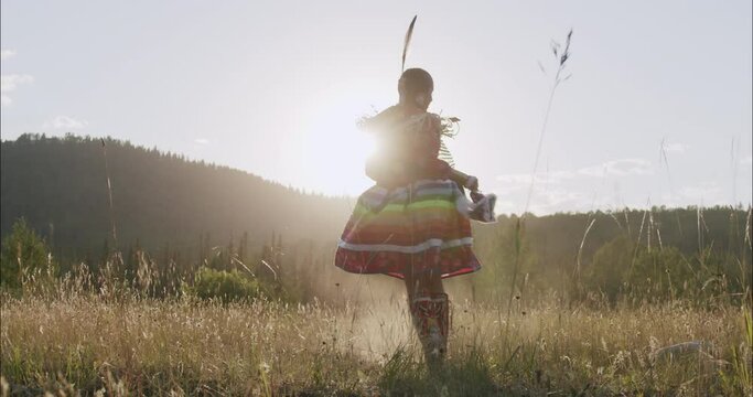 Beautiful Shot of Young Indigenous Woman Fancy Dancing In traditional Regalia