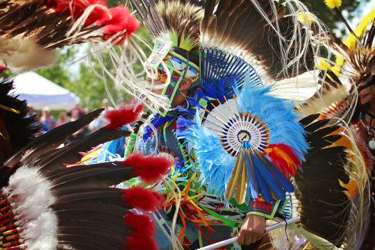 young native American girl in colorful regalia at an outdoor dance event. pow wow community