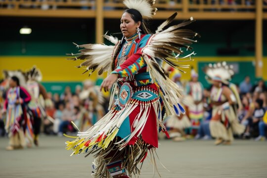 Native American powwow gathering filled with vibrant dances and music, exuding an engaging atmosphere Generative AI