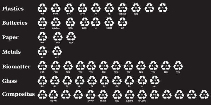 Plastic recycling code icon set. plastic recycling code 01-07 icon set. plastic recycling code symbol icon PETE, HDPE, PVC, LDPE, PP, PS, OTHER.
