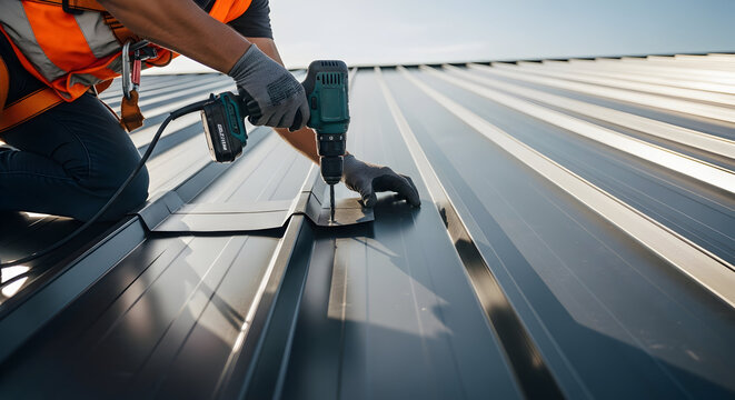 Professional Rooftop Carpenter Securing Metal Roof with Power Drill.