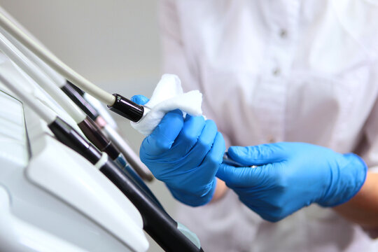 Disinfection of dental equipment. A dental assistant disinfects instruments before receiving patients. Concept of sanitation and hygiene in the clinic. Close up