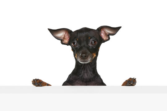 Curiosity. Portrait with one curious dog Prague ratter looking with clever face isolated over white background. Obedient dog