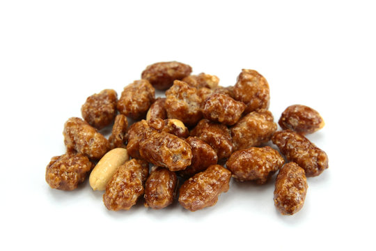 Cinnamon-coated pecans stacked and arranged on a clean white background for a delightful snack experience