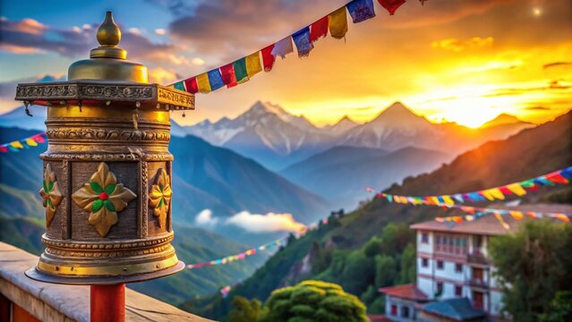 Serene Mountaintop Prayer: A Tibetan Prayer Wheel Amidst the Himalayas