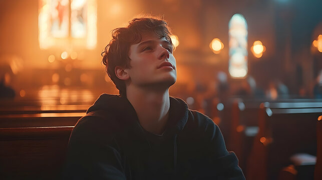 Young Man in a Church Pew Looking Up Illustration