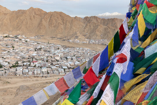 Stunning panorama of Leh and Tibetan prayer flags