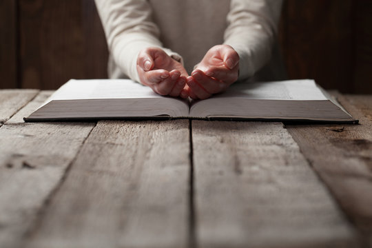 woman hands on bible. she is reading and praying over bible in a dark space over wooden table