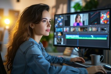 Creative Female Cinematographer Perfecting Video Montage Using Digital Software In Studio Office