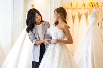 Portrait of smiling happy love asian fashion bride woman talk and try on wedding dress with woman shop owner for pre wedding at wedding interior fashion studio.