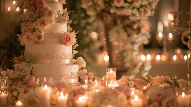 A grand multi-tier wedding cake adorned with delicate flowers and surrounded by candles