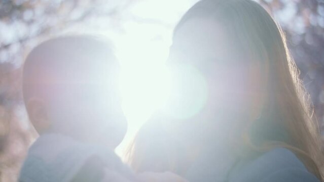 Tender moment of mother and daughter kissing in blooming field of flowers surrounded by nature