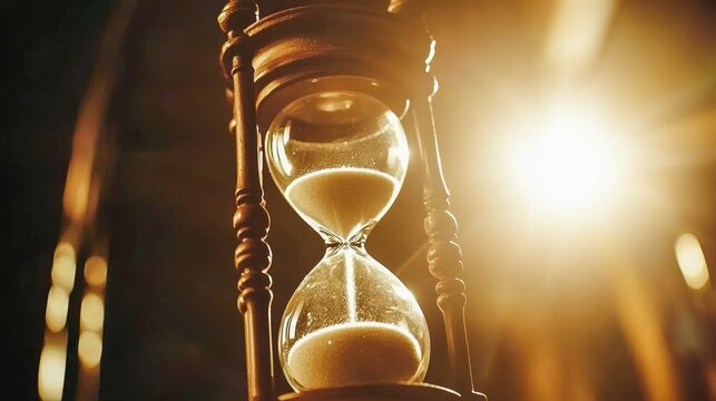 Time's Unfolding Sands: A close-up of an antique hourglass, sunlight filtering through the glass, highlighting the delicate flow of sand as time relentlessly marches on.