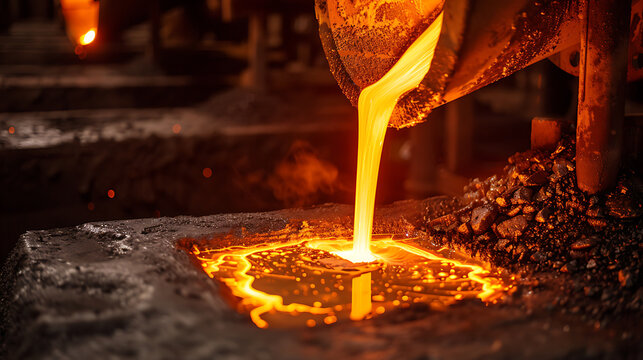 Goldsmith Melting Precious Metal in Crucible - Close-up view of a goldsmith melting precious metal in a crucible. The molten metal glows brightly orange, with sparks flying.