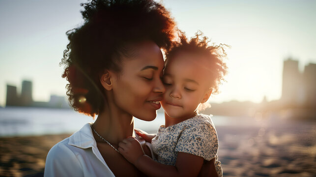 Mother walks with two children through golden grass field towards distant hills at sunset. Family enjoys peaceful nature scenery, cherishes summer vacation, precious moments together, creating