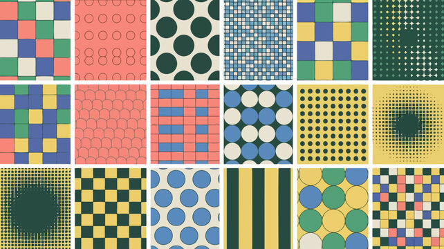 Collection of various geometric patterns and designs in a grid layout, showcasing different shapes and colors