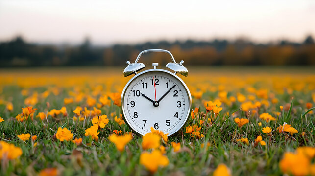 Vintage Alarm Clock In A Field Of Yellow Flowers