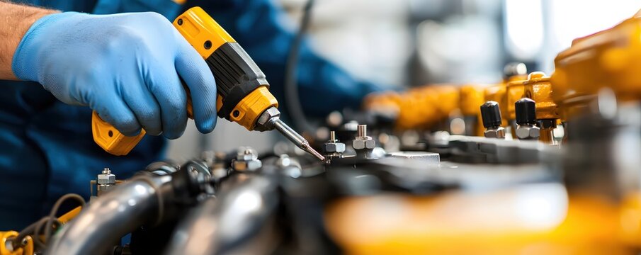 Mechanic precise work with yellow screwdriver on engine in workshop for auto repair service