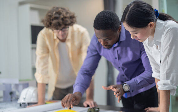 Architects plan low-carbon construction, analyzing blueprint, layout, calculating precise structure