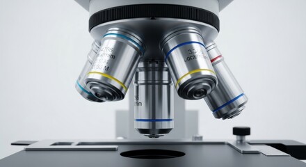 High-Magnification Microscope Objectives Focusing on Stage Slide, Representing Precision Optics for Scientific Discovery and Biotech Innovation.