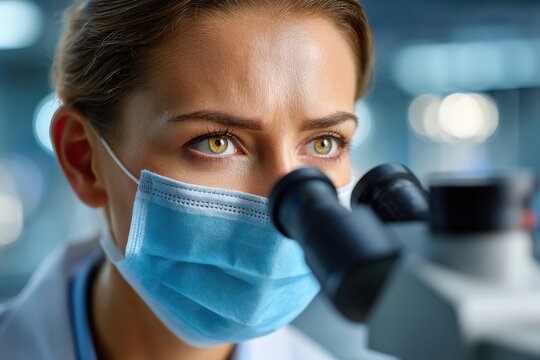 A focused medical professional in face mask using a microscope for research, conducting tests in a laboratory, showing precision and dedication to scientific discovery.