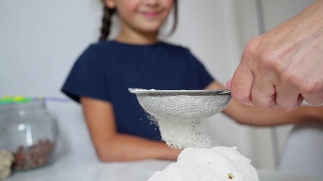 Capturing the exquisite art of baking with precision, carefully sifting flour onto dough for making delicious treats. Slow motion