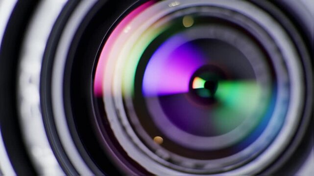 Close-up view of professional camera lens showcasing optical elements and detailed barrel rings with subtle surface reflection.