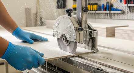 A tiler's hands using a wet saw to cut a ceramic tile with water spraying an action shot of precision construction work with copy space
