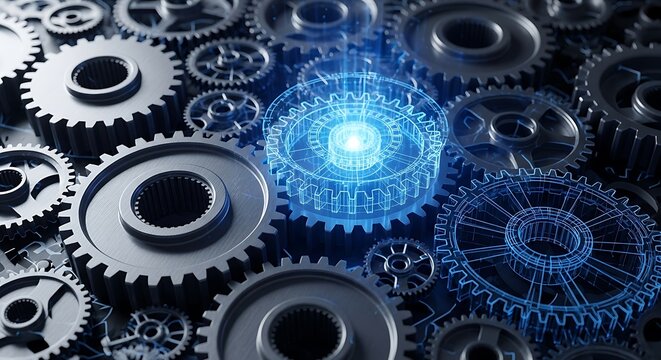 Metal gears and blue digital schematic mechanism close up technology engineering