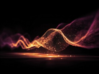 Golden digital wave flowing through darkness, symbolizing innovation, data movement, and the harmonious connection between technology and creativity