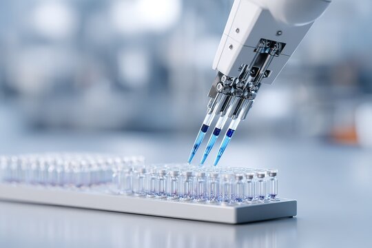 A futuristic pipette dispensing liquid into test tubes
