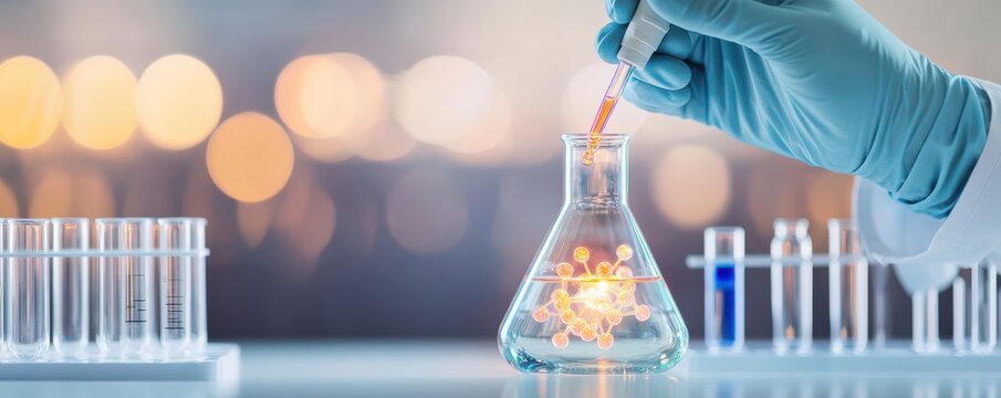 A scientist in a laboratory uses a pipette to transfer liquid into a flask, showcasing scientific experimentation and innovation.