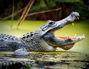 an alligator with its mouth open in the swamp showcasing its teeth and predatory nature