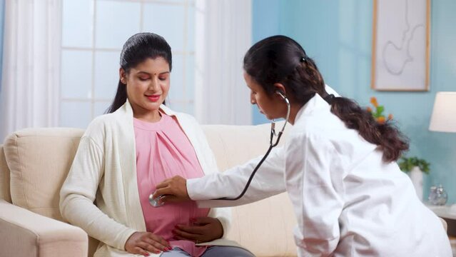 Shoulder shot of Indian doctor examining baby movement of pregnant woman belly by using stethoscope at home - concept of home health checkup, pregnancy care and medical treatment