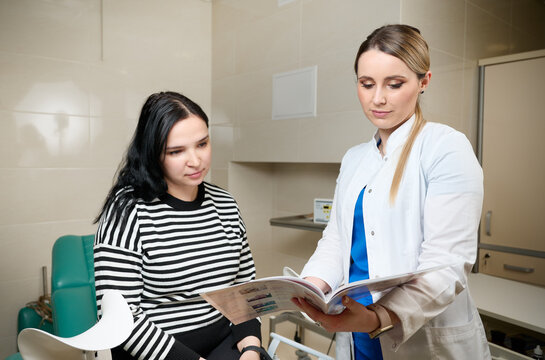 Pretty female doctor gynecologist consulting pregnant woman. Examining and consulting young pregnant girl patient in clinic.Obstetrical examination. Baby and mother healthcare check up. Women's health