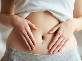 A woman gently places her hands on her lower abdomen, suggesting a focus on digestive health, wellness, or early pregnancy awareness in a calm setting.